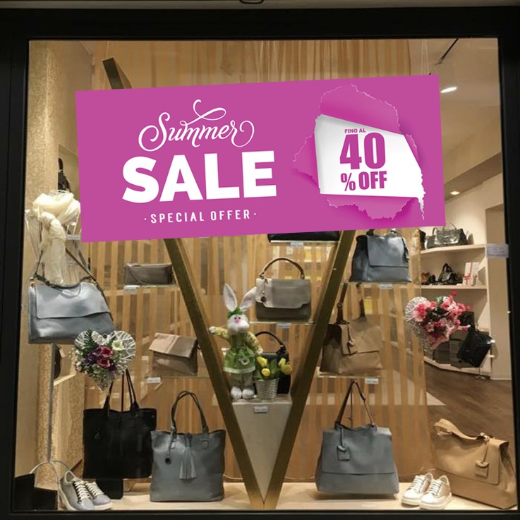 Adesivo in vetrofania ideale per le promozioni Saldi, ottimo per la tua Campagna Promozionale !!! Grazie allampia scelta di formati puoi rendere la tua attività elegante o spiritosa . Sticker saldi perfetto per vetrine e ad ogni genere di superficie liscia Consulta la nostra guida per unapplicazione senza bolle daria e pieghe. Utilizziamo solo adesivi di alta qualità prodotti e conformi alla normativa Europea. Inoltre aggiungi al tuo ordine la comoda spatola che assieme al nostro tutorial , renderà l applicazione del tuo adesivo semplice e pratica!!!!!! N.B. Le misure possono variare di qualche cm rispetto a quelle indicate dal sito. Inoltre, prestare attenzione, agli orientamenti delle immagini: se sono in orizzontale tenere conto che la misura più grande è la base, diversamente se le immagini sono in verticale la base sarà il lato più piccolo e laltezza sarà il lato più grande. Questo adesivo viene prodotto con un righino bianco di circa 3/7 mm intorno a tutte le parti stampate dellimmagine, volutamente per dare profondità allo stickers, e allo stesso modo può adattarsi a tutti i colori delle superfici da personalizzare.